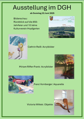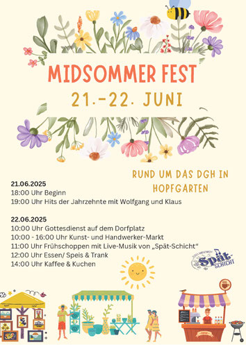 Der Kulturverein wird am Midsommerfest der Vereine mit der Organisation eines Kunsthandwerkermarktes rund um das DGH und einer Kunstausstellung im DGH vertreten sein.
