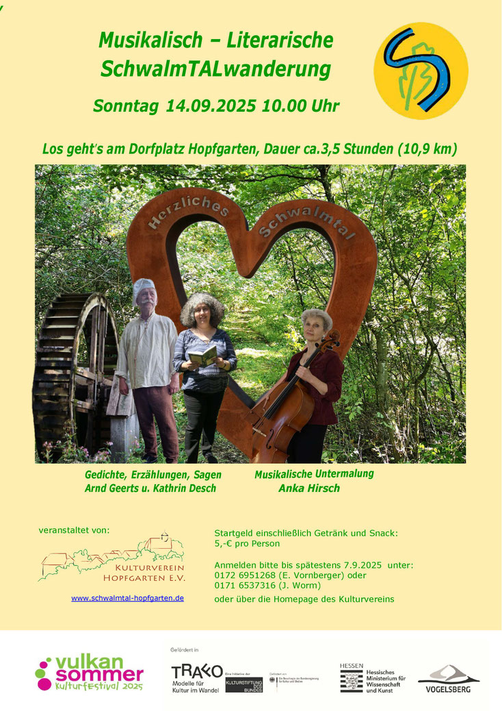 An verschiedenen Stellen entlang der Wanderroute werden Gedichte untermalt mit Cello, Cellostücke oder Sagen passend zu dem jeweiligen Standort eine besondere Atmosphäre erzeugen, und das Naturerlebnis intensivieren ...