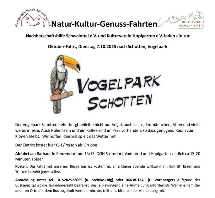 Anmeldung unter Tel.: 015202522069 (R. Steinke-Faig) oder 06638-1245 (E. Vornberger) Aufgrund der Buskapazität ist die Teilnehmerzahl begrenzt, deshalb zwingend eine Anmeldung erforderlich. Wer in einem der anderen Orte mit dem Bus abgeholt werden möchte, teilt dies bitte bei der Anmeldung mit.