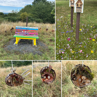 Auf der Straße vor dem DGH warteten die Aussteller des Kunst-Handwerker-Marktes auf Interessenten. Da war neben den Honigprodukten viel Holzdesign, aber auch Genähtes zu entdecken, Holzplastiken und Gemälde vom Melchiorsgrund und die Upcycling-Skulpturen von Beatrix Anlauff.