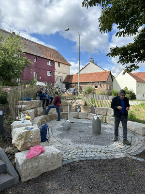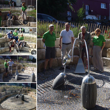 Dann wurde der Knopf gedrückt und das Wasserspiel begann. Sowohl die Brunnenplastik von Beatrice in Form der Eicheln auf dem gemauerten Eichenblatt des Untergrundes als auch das feinen Wasserspiel fanden große Anerkennung und viele Bewunderer: "mal wirklich was anderes als immer diese Basaltsäulen!"