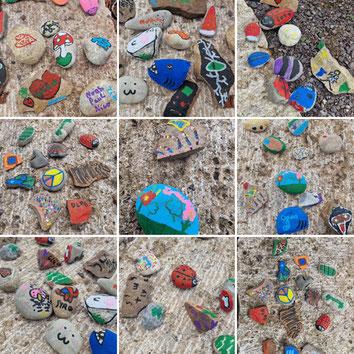Der Wetterbericht hat uns in den Tagen davor den Atem anhalten lassen. Aber es war dann doch möglich. Zwar wurde das Bemalen der Steine kurzerhand nach innen in den Schulungsraum der Feuerwehr verlegt; das war keinerlei Problem, die Kinder bemalten mit Begeisterung die vorbereiteten Steine. Besonders spannend für die Begleiter war, dass einige bereits in den Steinen schon Formen und Figuren sahen, die sie dann mit Farbe hervorholten.
