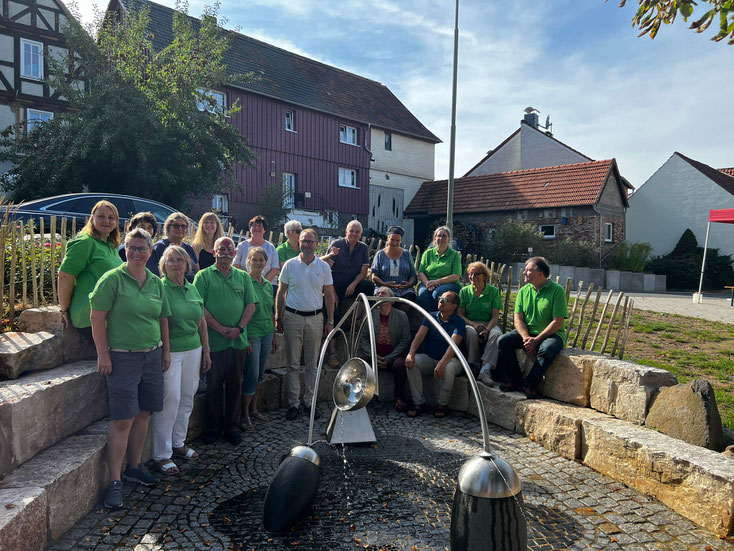 Am neuen Brunnen, der noch etwas spärlich Wasser spendet, ließ es sich gut rasten. Natürlich gab es auch genügend Kulinarisches, vom Gegrillten über Kuchentheke, die dank fleißiger Helfer wieder besonders üppig ausgefallen war. Und mit den neuen T-Shirts waren die Kulturvereinsmitglieder natürlich auch überall schnell zu entdecken. Stellvertretend für alle Helfer die 4 mit den neuen Shirts, die am längsten ausgeharrt hatten. Insgesamt ein gelungenes Fest, wenn auch die Hitze dem ein oder anderen arg zugesetzt hatte und für einige doch Grund genug war, sich nicht nach draußen zum Fest zu bewegen.