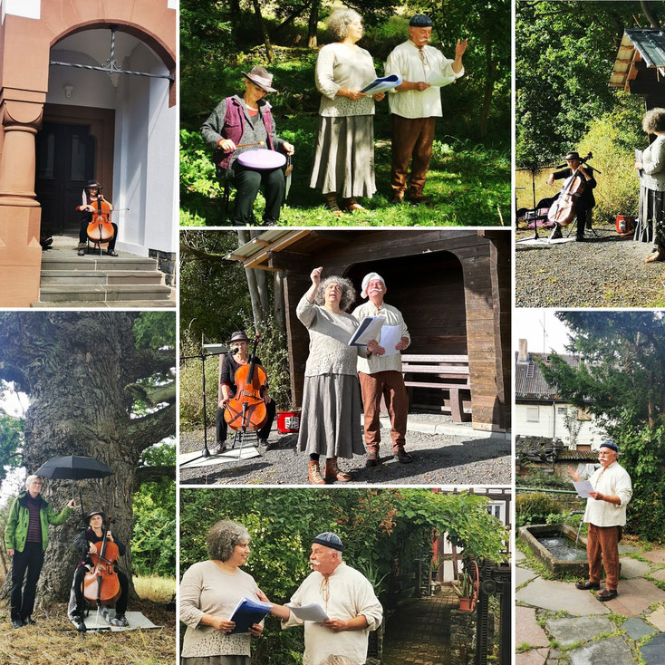 Es war ein ganz besonderes Erlebnis: die Musik, sehr gut ausgewählt von Anka Hirsch aus ihren eigenen Kompositionen, unterstützte und verstärkte die jeweilige Stimmung der Gedichte und Standorte. Die Gedichte passten perfekt zum Standort und wurden schauspielerisch und prägnant vorgetragen von Kathrin und Arnd in entsprechender Kleidung. Der rege Applaus war ein eindeutiges Kompliment an die Künstler.